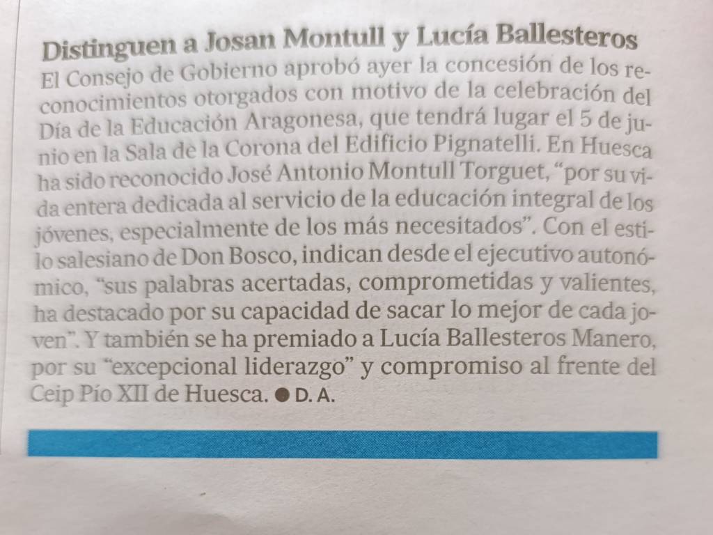 El próximo mes de junio, el Gobierno de Aragón rendirá homenaje a dos figuras destacadas del ámbito educativo aragonés con la entrega de la Cruz de José de Calasanz: Lucía Ballesteros y José Antonio Montull. Ambos han sido seleccionados por su trayectoria ejemplar y su compromiso con una educación pública de calidad, inclusiva e innovadora.